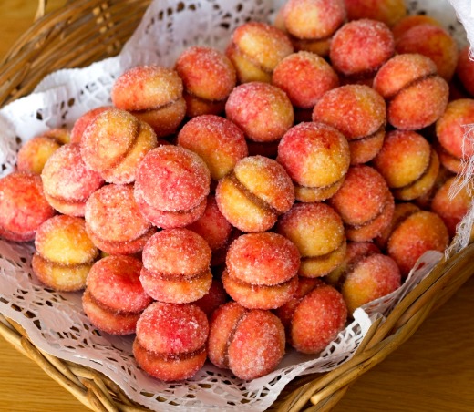 Acest desert este un dulce al copilăriei pe care gospodinele îl preparau cu ocazia sărbătoririi Crăciunului sau a diferitelor evenimente importante din familie. Este o rețetă inspirată din bucătăria italienească. În mod normal pot fi umplute cu ciocolată, marmeladă sau cremă de vanilie. Denumirea vine de la forma de piersică pe care aceste prăjiturele o au.